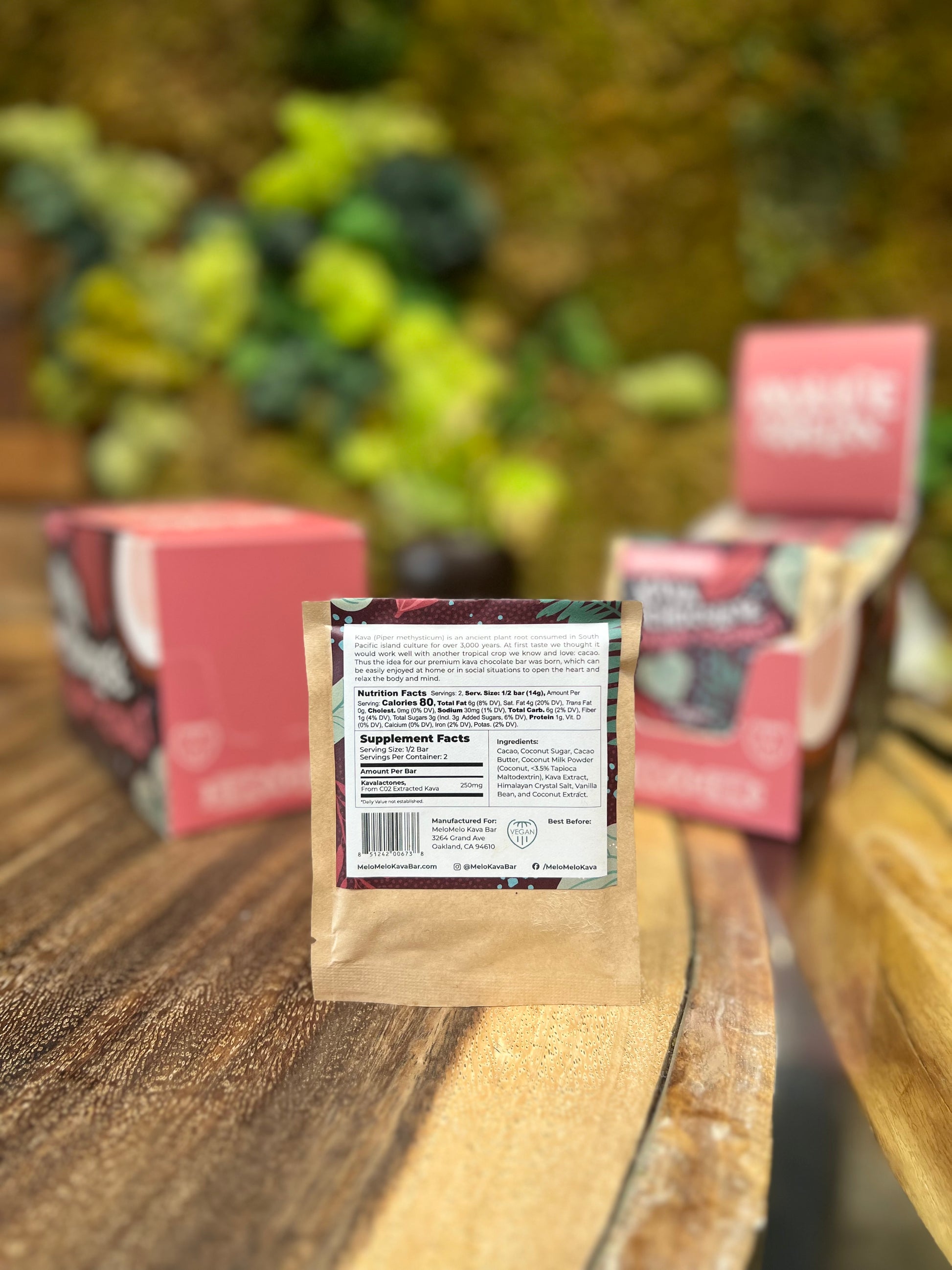 Ingredients: Cacao, Coconut Sugar, Coconut Milk Powder, Cacao Butter, Vanilla Bean, Salt, and Kava Extract.